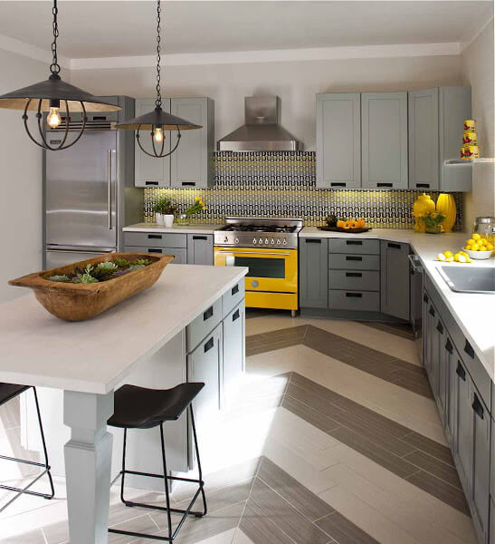 Šedou můžete využít na větší plochy, tedy na podlahu, pro výmalbu či na nábytek. Vždy ji kombinujte s neutrální bílou či s nějakou další výraznější barvou, což v tomto případě bude jasně žlutá. Žlutou pak použijte na menší plochy a na dekorace.